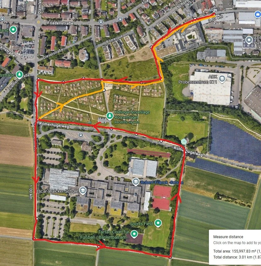 Die Laufstrecke ähnelt der 660m Strecke, aber statt entlang der Schönbeinstraße laufen wir parallel in der Friedenstraße bis zur Oscar-Walcker-Straße, dann entlang der Oscar-Walcker-Straße auf direktem Weg zurück zur Box.